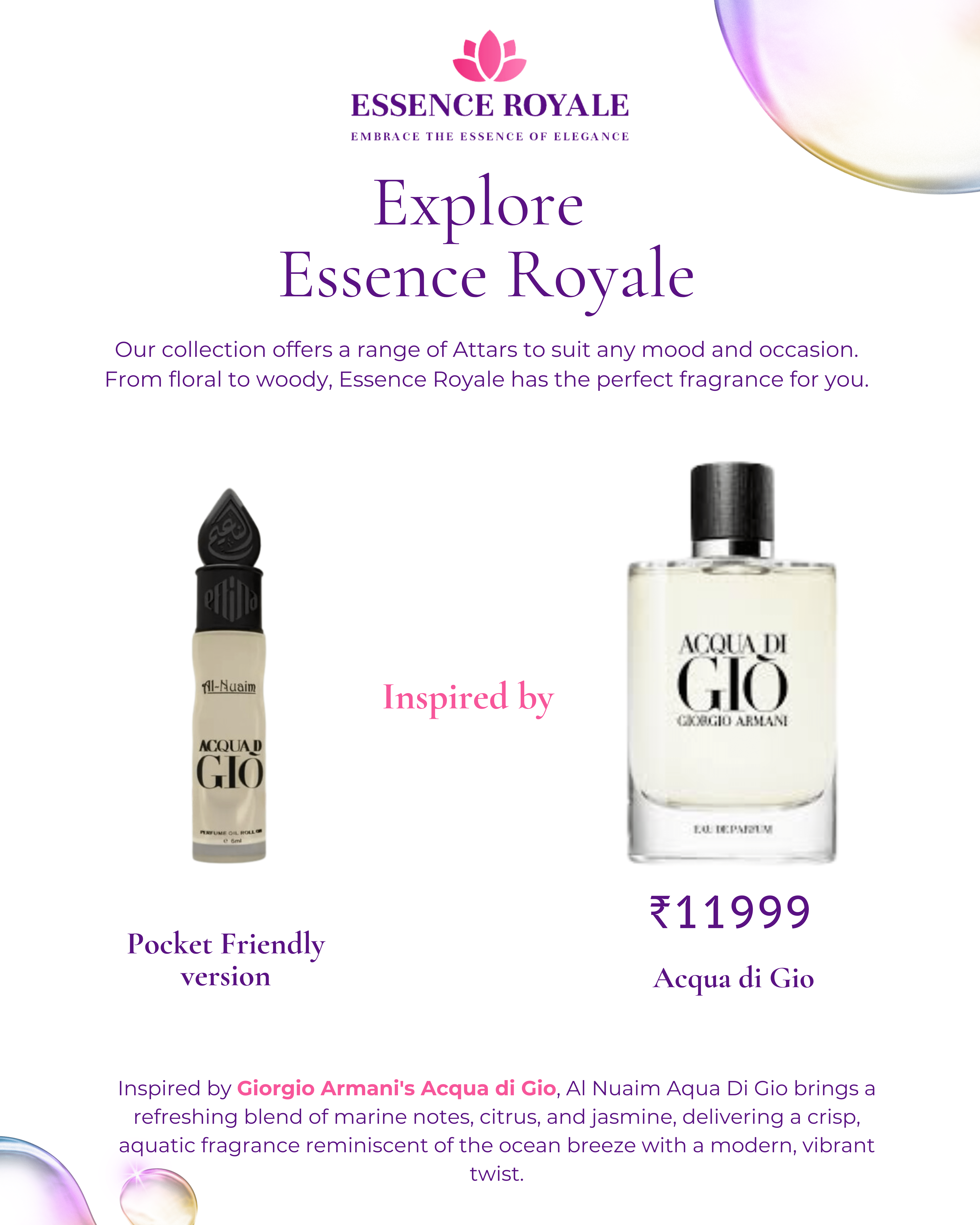 Immerse yourself in the fresh, aquatic aroma of Acqua D Gio Attar. With vibrant citrus top notes, this fragrance brings the breezy essence of the ocean to your day. Ideal for daytime wear, it’s refreshing and light, perfect for any casual outing.